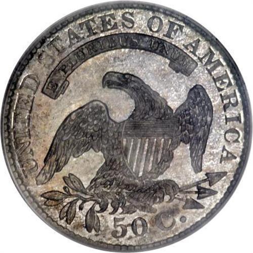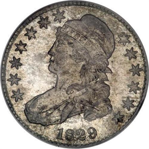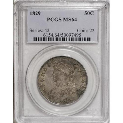 <B>1829 50C Small Letters MS64 PCGS.</B></I> O-105, R.1. Dusky almond-gold and dove-gray toning embraces this originally toned, satiny, and semi-prooflike representative. The upper stars, the branch stem, and the left border of the scroll are soft, but the portrait and eagle are sharply struck. Inconsequential marks are present, which have no effect on the obvious eye appeal. Population: 39 in 64, 13 finer (11/07).<BR><BR><B>Coin Engraver:</B> John Reich<BR><BR><b>Shipping:</b> Coins & Currency (<a target="_blank" href="http://www.heritageauctions.com/common/shipping.php">view shipping information</a>)