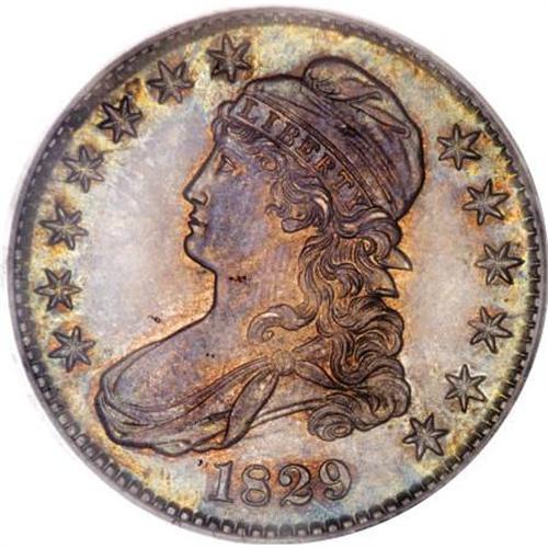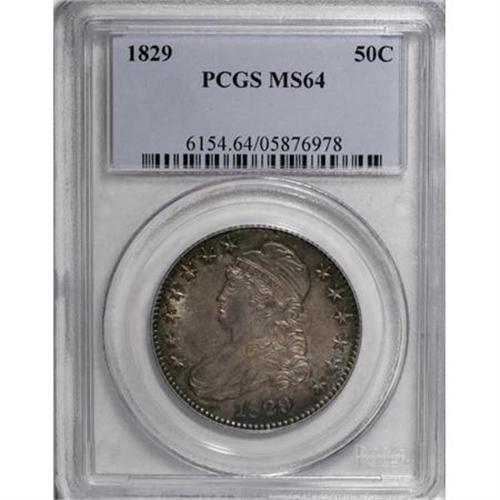 <B>1829 50C Small Letters MS64 PCGS.</B></I> O-115, R.1. The inner left border of the shield extends into the eagle's tail feathers below, and the lower arrowhead is recut on the upper back side near the shaft. This is a gorgeous near-Gem specimen that is covered over both sides by a rich complement of deep, original toning. Amber, rose-gray, and turquoise are the most prominent hues. The design elements are all crisply struck, and there are virtually no marks on either side of the piece. A faint thumbprint, just below Liberty's ear, is the only slight distraction that might have prevented a Gem grade assessment. <BR><BR><B>Coin Engraver:</B> John Reich<BR><BR><b>Shipping:</b> Coins & Currency (<a target="_blank" href="http://www.heritageauctions.com/common/shipping.php">view shipping information</a>)