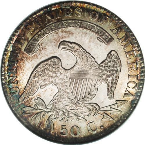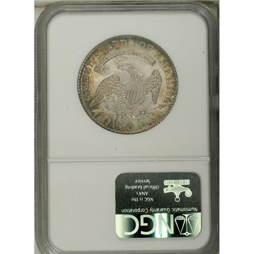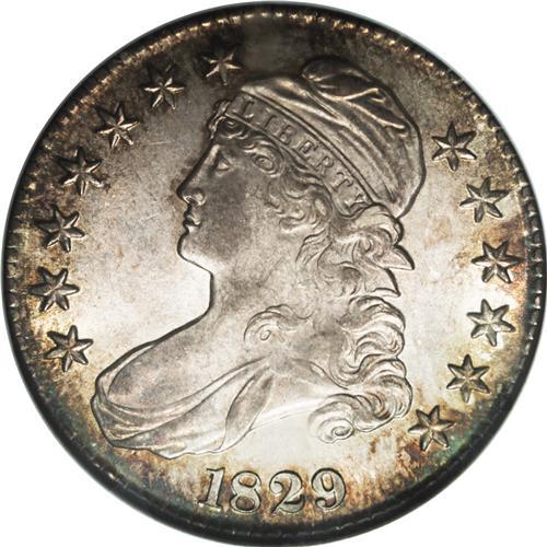 <B>1829 50C Small Letters MS65 NGC.</B></I> O-108a, R.3. Lovely golden-brown and aquamarine toning endows the margins of this lustrous and well preserved Gem. The strike is decisive near the rims, although the vertical shield lines exhibit blending. A beautiful Gem that would benefit even the finest specialized holding.<BR><BR><b>Shipping:</b> Coin/Currency (<a target="_blank" href="http://www.heritageauctions.com/common/shipping.php">view shipping information</a>)