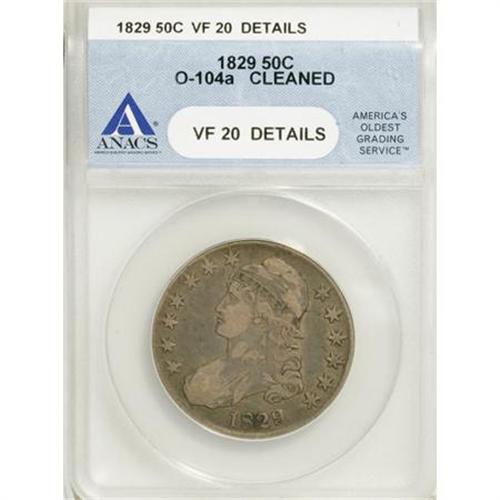 <B>1829 50C Small Letters--Cleaned--ANACS. VF20 Details.</B></I> O-104A. NGC Census: (4/2061). PCGS Population (8/831). Mintage: 3,712,156. Numismedia Wsl. Price for NGC/PCGS coin in VF20: $46. (#6154)<BR><BR><B>Coin Engraver:</B> John Reich<BR><BR><b>Shipping:</b> Coins & Currency (<a target="_blank" href="http://www.heritageauctions.com/common/shipping.php">view shipping information</a>)
