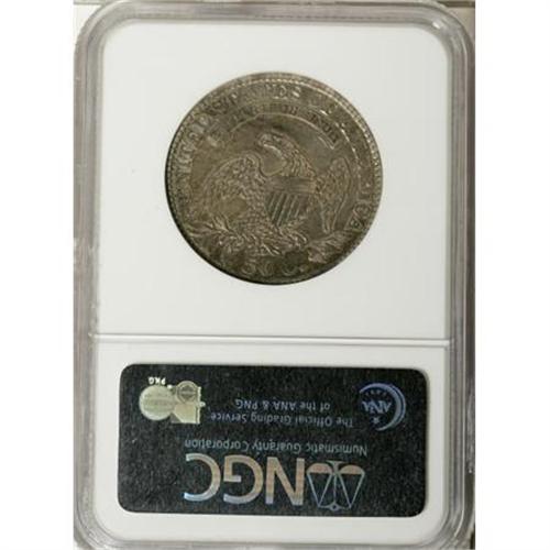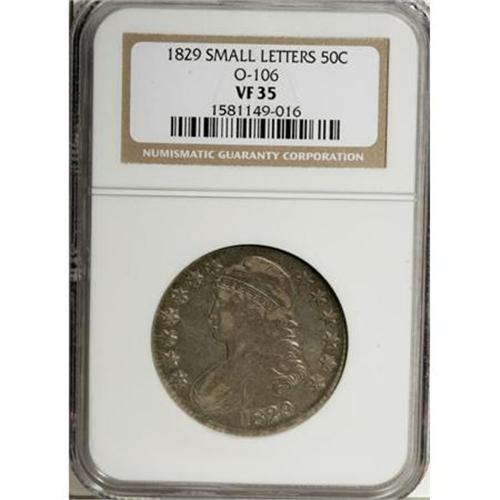 <B>1829 50C Small Letters VF35 NGC.</B></I> O-106, R.5. This rare variety can be confirmed by two features; a faint die crack from star 10 to the curls, and light recutting on the left foot of the first A in AMERICA. A lilac-gray Choice VF half with few marks given its grade.<BR><BR><B>Coin Engraver:</B> John Reich<BR><BR><b>Shipping:</b> Coins & Currency (<a target="_blank" href="http://www.heritageauctions.com/common/shipping.php">view shipping information</a>)
