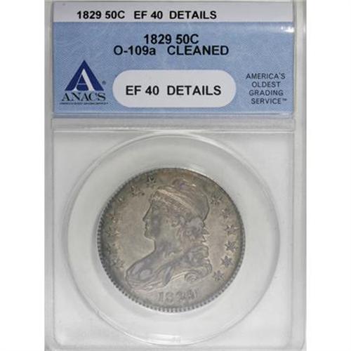 <B>1829 50C Small Letters--Cleaned--ANACS. XF40 Details.</B></I> O-109a, R.4. The reverse field is slightly bright, but many collectors would enjoy possession of this partly lustrous scarce die variety representative. A faint cluster of abrasions is present beneath the eagle's head, and Liberty's chin and neck each have faded thin marks.<BR><BR><B>Coin Engraver:</B> John Reich<BR><BR><b>Shipping:</b> Coins & Currency (<a target="_blank" href="http://www.heritageauctions.com/common/shipping.php">view shipping information</a>)