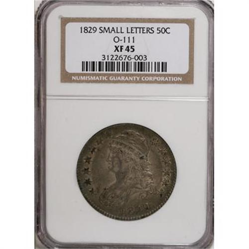 <B>1829 50C Small Letters XF45 NGC.</B></I> O-111. NGC Census: (80/4245). PCGS Population (91/631). Mintage: 3,712,156. Numismedia Wsl. Price for NGC/PCGS coin in XF45: $204. (#6154)<BR><BR><B>Coin Engraver:</B> John Reich<BR><BR><b>Shipping:</b> Coins & Currency (<a target="_blank" href="http://www.heritageauctions.com/common/shipping.php">view shipping information</a>)