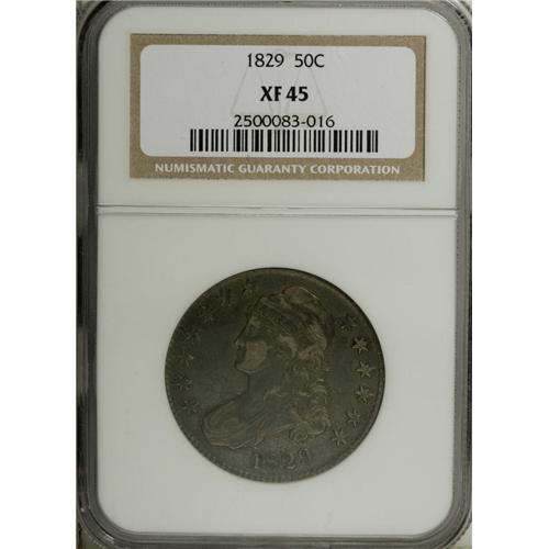 <B>1829 50C XF45 NGC.</B></I> O-104, R.3. The early die state of this variety (sometimes called the "prime" die state by collectors) is considerably scarcer than the usual late die state. According to the most recent auction analysis by Stephen Herrman, this example is the second finest of the early die states to be offered in several years. The surfaces display deep olive-gray color with subtle blue and iridescent toning, the devices having some lighter tan. It is a pleasing piece and a coin that advanced specialists should find quite desirable.<BR><I>From The Westmoreland, Virginia Collection, Part Two.</B></I><BR><BR><b>Shipping:</b> Coin/Currency (<a target="_blank" href="http://www.heritageauctions.com/common/shipping.php">view shipping information</a>)