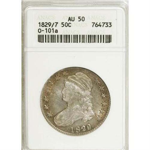 <B>1829/7 50C AU50 ANACS.</B></I> O-101a. NGC Census: (8/3887). PCGS Population (15/93). Numismedia Wsl. Price for NGC/PCGS coin in AU50: $425. (#6155)<BR><BR><B>Coin Engraver:</B> John Reich<BR><BR><b>Shipping:</b> Coins & Currency (<a target="_blank" href="http://www.heritageauctions.com/common/shipping.php">view shipping information</a>)