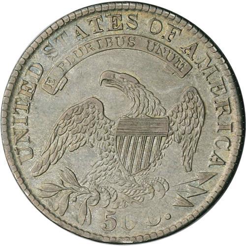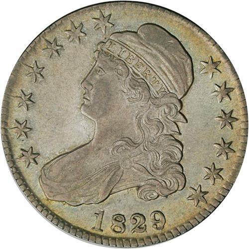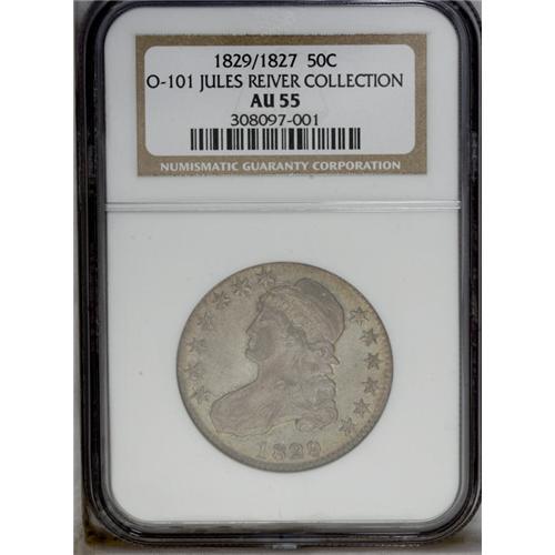 <B>1829/7<50C> AU55 NGC.</B></I> O-101, R.1. All digits in the date are recut on this variety. The 18 is lower, and the 29 is higher. The curl-base 2 is recut over a square-base 2. The motto is recut and the 50 C. is high, with the C nearly closed. The current example is a lovely greenish-gray, with flashes of sunset-orange at the borders and magenta on the obverse highpoints. The reverse is a more organized greenish-gray, with an aqua center. Abundant mint luster shines from underneath the toning. The strike is robust, with weakness noted only at the first T of STATES and at 50 C., as usually found on this variety. Envelope Included.