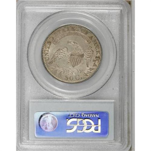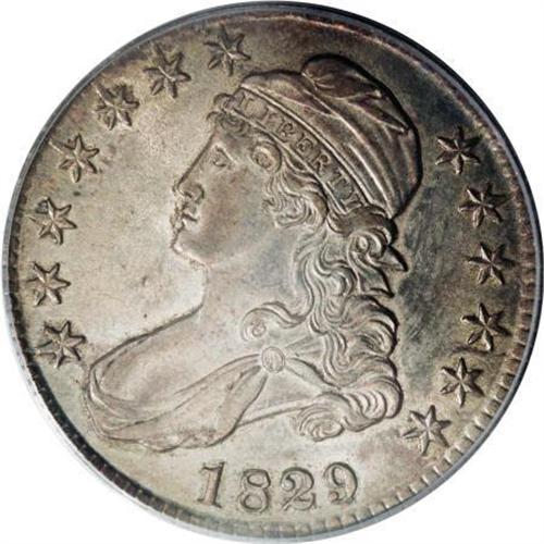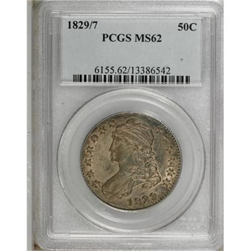 <B>1829/7 50C MS62 PCGS. CAC.</B></I> O-101a, R.1. Die lapping has removed the tail feathers and the arrow shafts near the claws. The base and serif tips of the underdigit 7 remain apparent on this satiny Bust half. Rich apricot and green-gold toning graces the undisturbed surfaces. Evenly struck and attractive. Population: 8 in 62, 23 finer (11/07).<BR><BR><B>Coin Engraver:</B> John Reich<BR><BR><b>Shipping:</b> Coins & Currency (<a target="_blank" href="http://www.heritageauctions.com/common/shipping.php">view shipping information</a>)