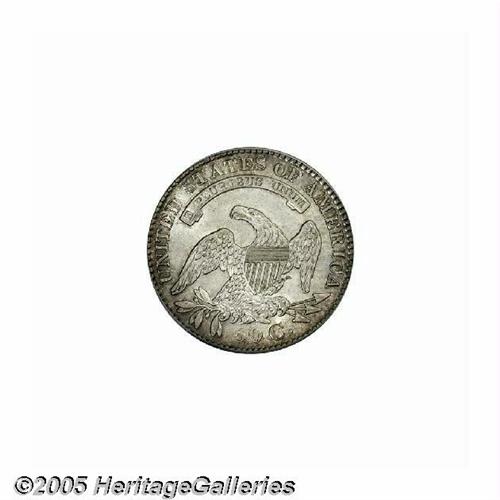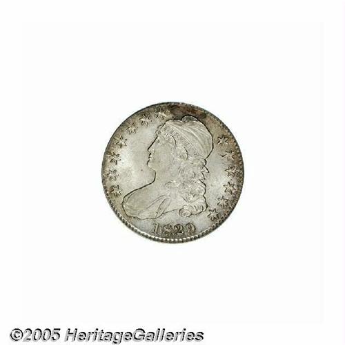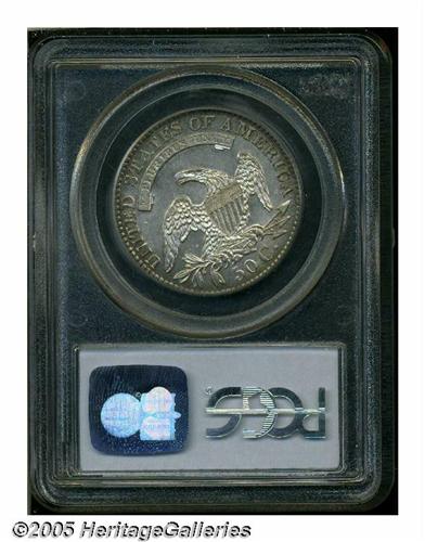 <B>1829/7<50C> MS63 PCGS.</B></I> O-102, R.2. Technically, this variety is an 1829/1827 overdate, since all four digits are recut. This well struck and shimmering representative has gentle pastel lilac and chestnut colors. Surprisingly unabraded, the surfaces are very smooth, even when inspected beneath a loupe. A small mint-made strike-thru beneath the final A in AMERICA provides a pedigree reference to future catalogers. Population (for O-101 and O-102 combined): 8 in 63, 10 finer (6/05).