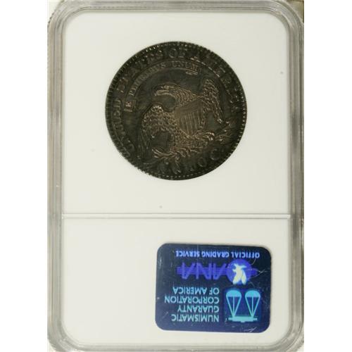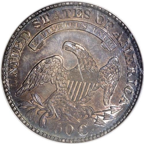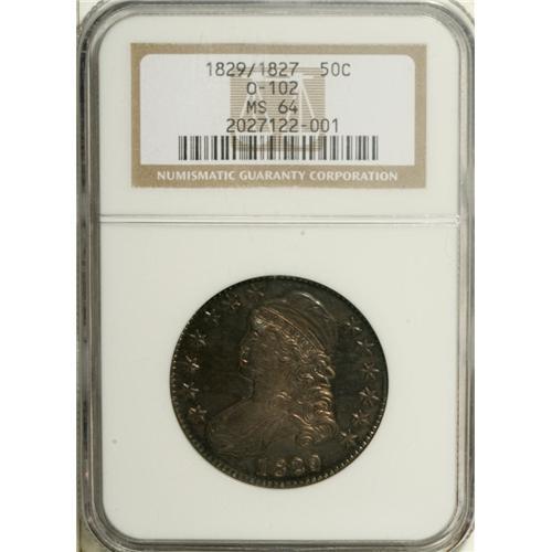 <B>1829/7 50C MS64 NGC.</B></I> O-102, R.2. The upright of the digit 7 appears beneath the right side of the 9 in the date, yet there is virtually no trace of the top of the 7, which is why this overdate was described as "1829/1" for many years. This example is fully prooflike, with mirrored fields visible beneath deep gold and steel toning. A few prooflike examples of this variety are known, although no proofs have been described in the literature.<BR><I>From The Rocky Top Collection of Bust Half Dollars.</B></I><BR><BR><b>Shipping:</b> Coin/Currency (<a target="_blank" href="http://www.heritageauctions.com/common/shipping.php">view shipping information</a>)
