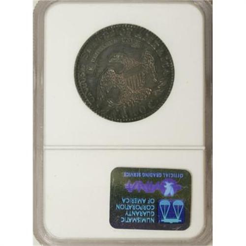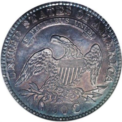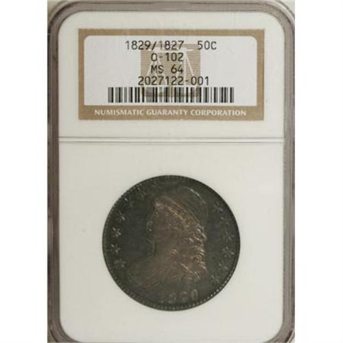 <B>1829/7 50C MS64 NGC.</B></I> O-102, R.2. The upright of the digit 7 appears beneath the right side of the 9 in the date, yet there is virtually no trace of the top of the 7, which is why this overdate was described as "1829/1" for many years. This example is fully prooflike, with mirrored fields visible beneath deep gold and steel-blue toning. A few prooflike examples of this variety are known, although the literature describes no proofs.<BR><BR><BR><B>Coin Engraver:</B> John Reich<BR><BR><b>Shipping:</b> Coins & Currency (<a target="_blank" href="http://www.heritageauctions.com/common/shipping.php">view shipping information</a>\)