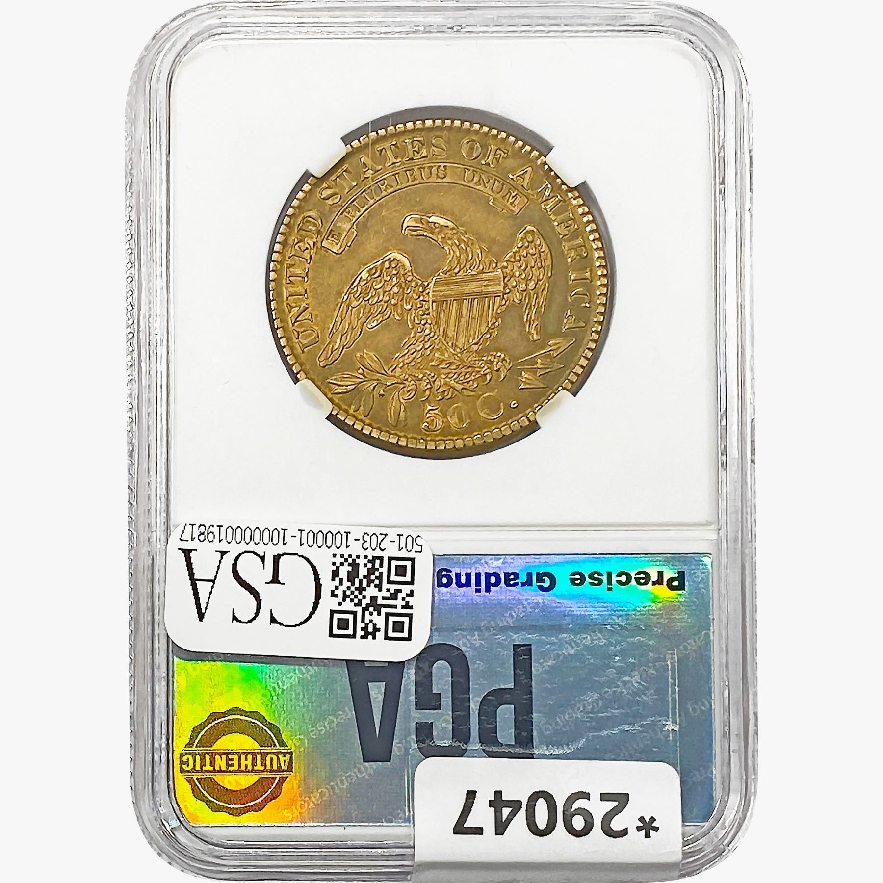 l. All non-certified coins and currency are guaranteed genuine, but are not guaranteed as to grade, since grading is a matter of opinion, an art and not a science, and therefore the description rendered by GSA or any third-party grading service may not agree with the opinion of others (including trained experts), and the same expert may not grade the same item with the same grade at two different times. GSA may, but is not obligated to, express an opinion as to non-certified numismatic items, in GSA’s opinion, or by its employees’ experience and the current interpretation of the American Numismatic Association’s standards as of the date the catalog was prepared. There is no guarantee or warranty expressed or implied that the grading opinions utilized by GSA, if any, will meet the standards of any grading service at any time in the future.