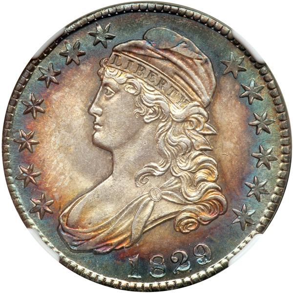 1829. NGC graded MS-63. Star. Well struck with lovely blue and light violet toning around the borders. Pop 2; 61 finer.