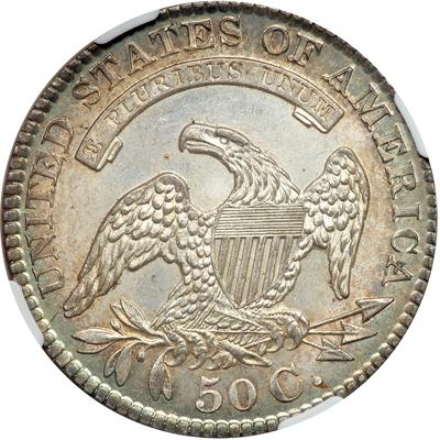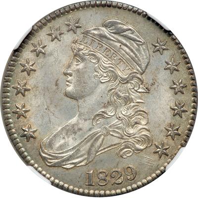 1829 Capped Bust Half Dollar. NGC graded MS-65 O-112. A satiny gem with energetic luster carefully capped by pale natural toning that seems determined to increase the coin's beauty and allure in the eyes of the numismatist. Given the proper amount of die pressure, the coin is fully brought up by the striking. We see no reason to supply an "however" here, even for the sharp stars, since there are no weak areas as are so often found on bust halves of the 1830s, none at all! In a new NGC 4 pronged holder.
