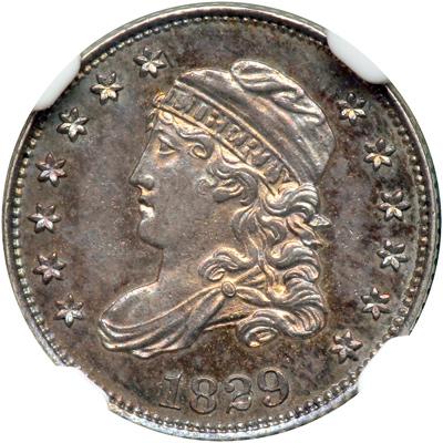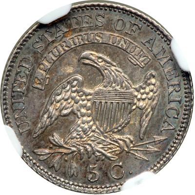 Die diagnostics: The upper right tip of the 5 in the denomination is aligned below the left border of the fletchings. Both obverse and reverse dies were used only for this single die marriage, listed as the first variety of the Capped Bust design in the Logan-McCloskey reference. Just three 1829 varieties have "three pale gules" reverse dies, the other two varieties die-linked to later "two pale gules" varieties. This variety is considered the first Capped Bust half dime minted as it is not die-linked to other varieties.