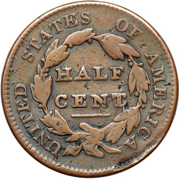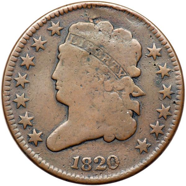 1829 C-1 R1 G6. Date Altered to 1820. Glossy light chocolate and medium brown. The surfaces are smooth but the rim and dentils above the head are a bit uneven and there are two pinprick nicks at the T in CENT. EDS, Manley state 1.0. The date was carefully altered to 1820, the 9 changed into an 0. Some of the tool marks required to make the change remain visible inside the "0" but the work was done with reasonable skill and this piece could fool some people. Of course "1820" is a fanciful date in the half cent series so fooling a serious collector is out of the question. Davy #29.1.17.