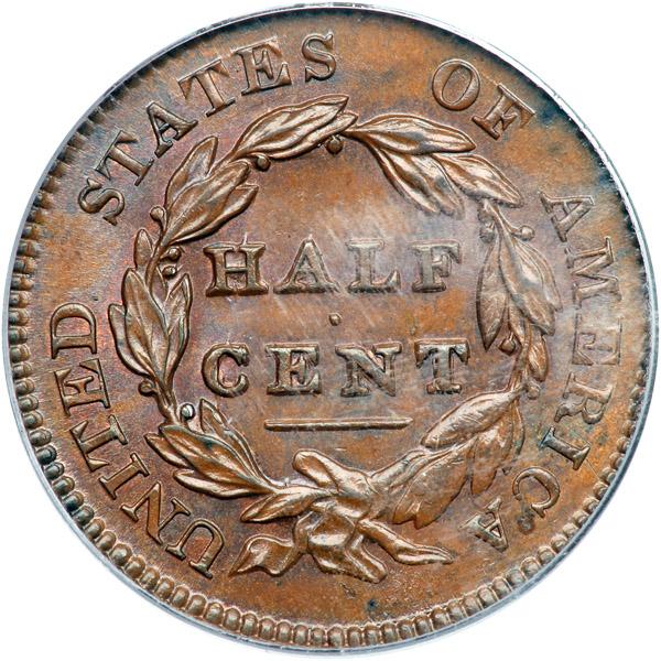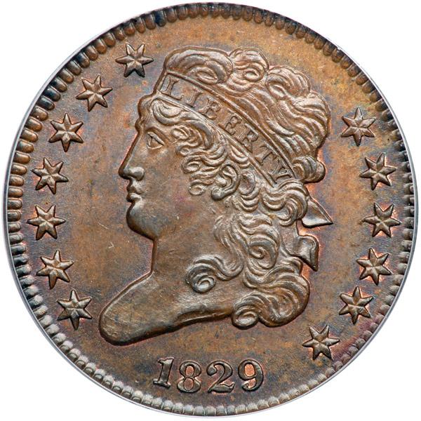 1829 C-1 R1. PCGS graded MS-64 Brown Plus. Highly lustrous medium brown and chocolate with delicate hints of bluish steel overtone and traces of mint red remaining on both sides. Outstanding eye appeal, virtually flawless in every respect. The only notable defects, and they are trivial, are a speck of dark toning in the dentils above star 7, another over the right top of the F in OF, and a pair of tiny hairline scratches at the I in AMERICA. E-MDS, Manley state 1.0, with the reverse rotated the usual 20 degrees CW. The fields are no longer prooflike thanks to microscopic die flowlines, and the die lines from the dentils over ICA are dull and barely visible. A truly impressive half cent. Removed from an NGC slab graded MS66BN (NGC label included, and it shows the attribution). Our grade is consistent with the PCGS grade. PCGS population 1; none finer in Brown. The attribution and Davy provenance are noted on the PCGS label. Davy #29.1.18.