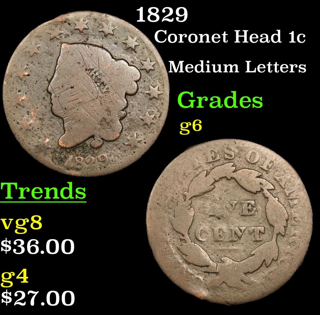 1829 Medium Letters . Coronet Head Large Cent 1c Grades g+.