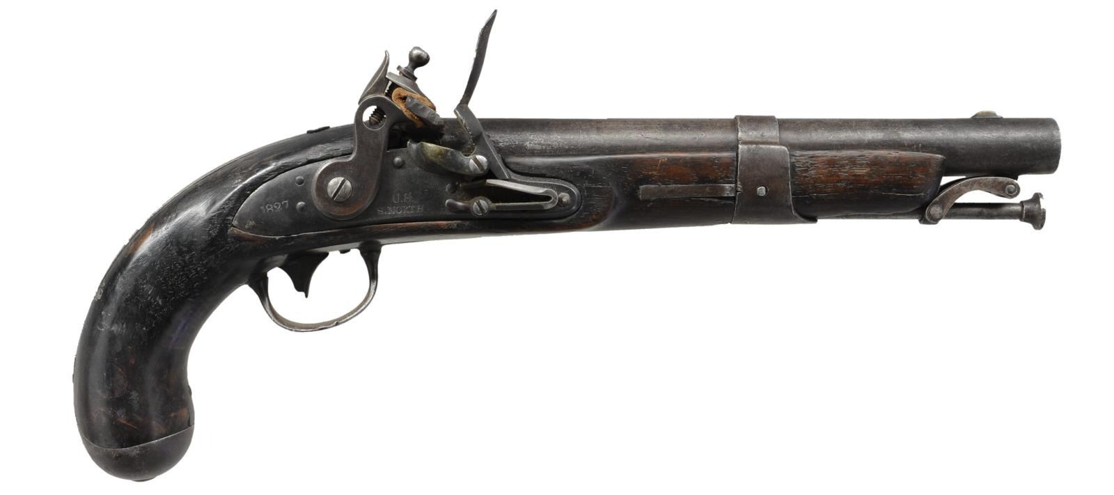 CONTRACT PISTOL. Cal. 54. NSN. The last military contract pistol by Simeon North, 3000 pistols were delivered to Brooklyn Navy Yard 1827-1829. Standard configuration with 8 5/8" barrel proofed "US / AH / P". (Asabel Hubbard-inspector). Lock is convex at tail, beveled flat forward of cock, dated "1827" & "US / S. NORTH", 3" belt hook. A vast majority of survivors were converted to percussion like this example and reconverted back to flint configuration for collectors. CONDITION: good overall, smooth dark iron patina, reconversion back to flintlock utilizing new cock & frizzen spring, stock sound with inset repair on bottom, no visible cartouche. Good mechanics, smooth bore. (01-22929/JS). ANTIQUE. $700-900.