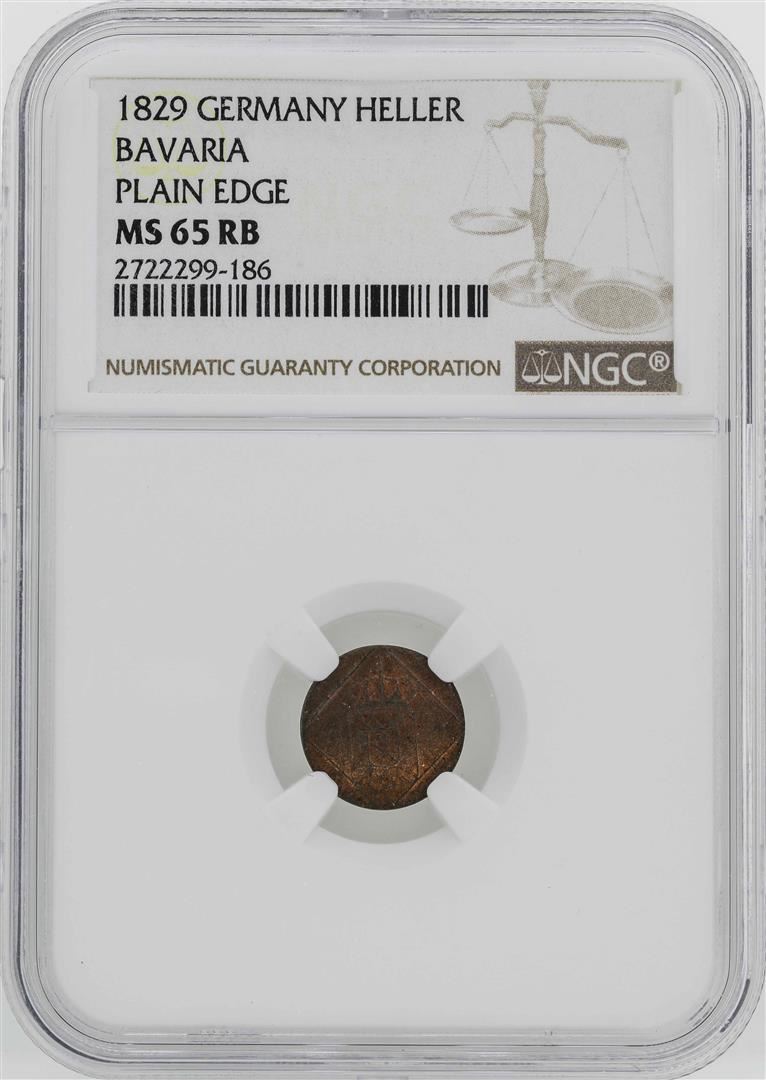 One 1829 Germany Bavaria Heller Coin NGC MS65RB. NGC Certified.