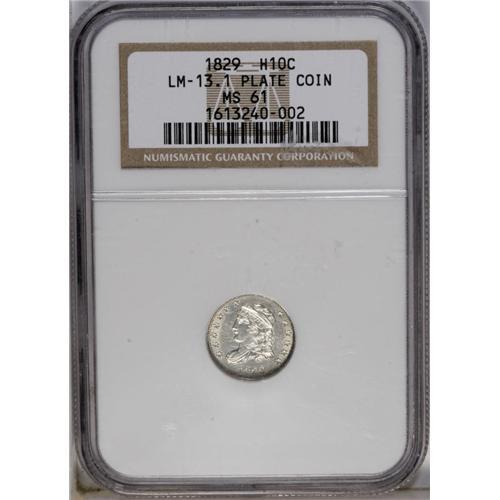 <B>1829<H10C>--LM Plate Coin--MS61 NGC.</B></I> V-12, LM-13.1, R.1. A hair-thin mark beneath the left (facing) wingtip identifies the present lot as the LM-13.1 plate coin within the 1998 Logan-McCloskey reference <I>Federal Half Dimes 1792-1837.</B></I> Brilliant and needle-sharp with subdued luster and a striking imperfection (as made) to the right of the shield.