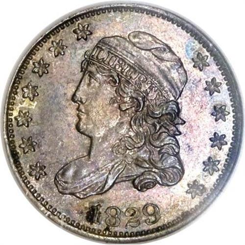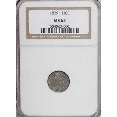 <B>1829 H10C MS63 NGC.</B></I> V-12, LM-13.1, R.1. Star 13 is rotated clockwise and close to the dentil, and the tip of the stem is over the serif of C. Gray, lilac, and blue patina covers lustrous surfaces, and the design elements are well struck. The dentilation is quite strong on both sides. Minor handling marks are noted on the obverse.<BR><BR><b>Shipping:</b> Coins & Currency (<a target="_blank" href="http://www.heritageauctions.com/common/shipping.php">view shipping information</a>)
