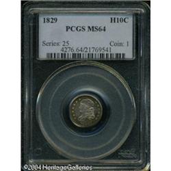 1829 H10C MS64 PCGS. LM-2, V-3, R-1. Gorgeously to <B>1829 H10C MS64 PCGS.</B></I> LM-2, V-3, R-1. Gorgeously toned in electric-blue, champagne-rose, sea-green, and golden-brown colors. This well struck near-Gem has a flashy semi-prooflike reverse and ample luster across the obverse. Population: 60 in 64, 25 finer (11/04). <BR><BR><B>Important notice:</B> Heritage usually auctions material at the rate of 200-250 lots per hour. On some occasions eBay Live bid software or the Internet may not be able to keep up with the pace of the auction. We recommend placing a realistic absentee bid now as insurance to avoid disappointment. Occasionally the auctioneer may eliminate or reject an eBay Live bid, and the auctioneer may also reopen a lot after the close of the eBay live bidding (usually because we missed an audience bid), and may reject your bid even if it shows you as the winning bidder. By bidding via eBay Live, you agree that Heritage may award the lot to another bidder at its sole discretion under the circumstances described above or any other reasonable circumstances. Since eBay bids are not shown to us until we open the lot on the floor, we treat those bids just like floor bids. In most cases the floor responds before the eBay bid is presented to us, due to Internet lag time, so for consistency we have made it a policy that floor bids are always considered first over tie eBay live bids. Also please note that all Heritage lots purchased through eBay Live carry a 20% Buyer's Premium. Please make sure you read the Terms and Conditions before you bid. This lot is being auctioned in conjunction with a live floor auction by Heritage Galleries & Auctioneers. All final auction and invoice information will be supplied by Heritage Galleries & Auctioneers, and all other information should be considered preliminary. Lot:5666
