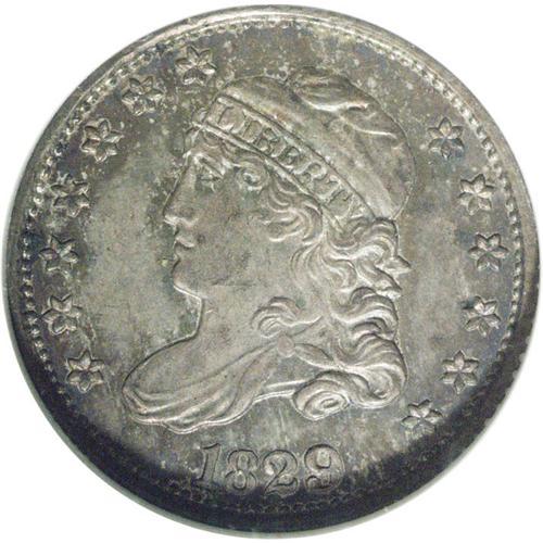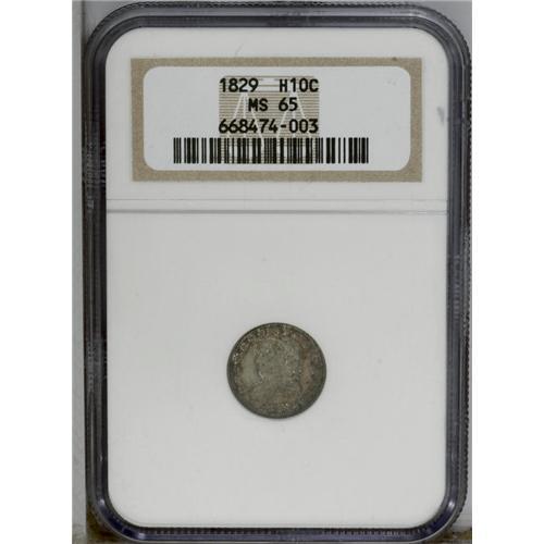 <B>1829<H10C> MS65 NGC.</B></I> V-2, LM-3, R.2. Rather deeply toned in carmine, russet, and emerald-green shades, being strongly struck and quite lustrous beneath the rich coloration. Impressive quality for this initial year of type. Census: 34 in 65, 20 finer (3/06). <BR><BR><B>Important notice:</B> Heritage usually auctions material at the rate of 200-250 lots per hour. On some occasions eBay Live bid software or the Internet may not be able to keep up with the pace of the auction. We recommend placing a realistic absentee bid now as insurance to avoid disappointment. Occasionally the auctioneer may eliminate or reject an eBay Live bid, and the auctioneer may also reopen a lot after the close of the eBay live bidding (usually because we missed an audience bid), and may reject your bid even if it shows you as the winning bidder. By bidding via eBay Live, you agree that Heritage may award the lot to another bidder at its sole discretion under the circumstances described above or any other reasonable circumstances. Since eBay bids are not shown to us until we open the lot on the floor, we treat those bids just like floor bids. In most cases the floor responds before the eBay bid is presented to us, due to Internet lag time, so for consistency we have made it a policy that floor bids are always considered first over tie eBay live bids. Also please note that all Heritage lots purchased through eBay Live carry a 20% Buyer's Premium. Please make sure you read the Terms and Conditions before you bid. This lot is being auctioned in conjunction with a live floor auction by Heritage Galleries & Auctioneers. All final auction and invoice information will be supplied by Heritage Galleries & Auctioneers, and all other information should be considered preliminary. Lot:1870 <BR><BR><B>Winning Notification and Billing:</B> After the FINAL session in this auction is complete, Heritage will send e-mail and snail mail invoices. This process normally takes several days. All final auction and invoice information will be supplied by Heritage Galleries & Auctioneers, and all other information should be considered preliminary. <BR><BR>This auction will be conducted on a live auction floor and over the Internet through eBay Live. If you choose to place an absentee bid, please take a moment to <font color='#0000ff'><u><a href='http://pages.ebay.com/liveauctions/help/before/laabsentee.html'>learn how eBay Live absentee bidding works</a></u></font><font color='#000000'>