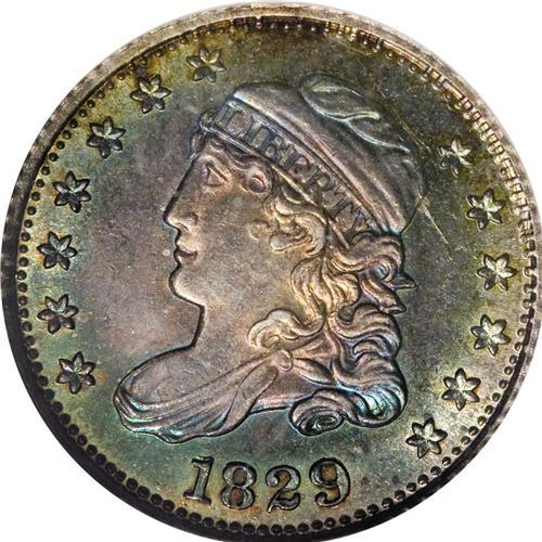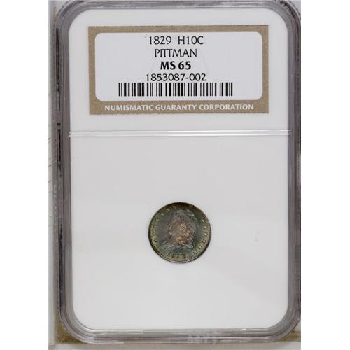 <B>1829 H10C MS65 NGC.</B></I> V-6, LM-5, R.1. Ex: Pittman Collection. The digit 1 in the date is doubled at the top, and there is an extra half-dentil between stars 9 and 10. On the reverse the E in STATES is sharply lower than the second T. Lush aquamarine peripheral coloration envelops both sides, while the obverse and reverse centers offer rose-gray patina. Despite the moderately deep toning, vibrant luster emerges unimpeded from beneath. A minor pinscratch extends just above and behind Liberty's head, preventing an even loftier grade assessment. A beautiful Gem example with an impressive pedigree.<BR><BR><b>Shipping:</b> Coin/Currency (<a target="_blank" href="http://www.heritageauctions.com/common/shipping.php">view shipping information</a>)