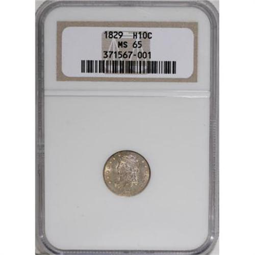 <B>1829 H10C MS65 NGC.</B></I> V-3, LM-2, R.1. Dynamic luster and pretty straw-gold and powder-blue toning adorns this exactingly struck and beautifully preserved Gem. A subtle gray spot near the O in OF provides an identifier. The first year of the Capped Bust type for the half dime, although the motif was introduced decades earlier on the half dollar. Census: 35 in 65, 21 finer (11/07).<BR><BR><B>Coin Engraver:</B> William Kneass<BR><BR><b>Shipping:</b> Coins & Currency (<a target="_blank" href="http://www.heritageauctions.com/common/shipping.php">view shipping information</a>)