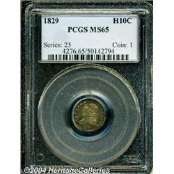 <B>1829<H10C> MS65 PCGS.</B></I> LM-2, V-3, R-1. Three vertical stripes in the shield, the I in UNITED is repunched. Splashes of orange, gold, apple-green, and lilac patina endow this exquisitely struck and lustrous Gem. Carefully preserved in addition to its beautiful toning, this first year type coin would be an impressive addition to any advanced collection. <BR><BR><B>Important notice:</B> Heritage usually auctions material at the rate of 200-250 lots per hour. On some occasions eBay Live bid software or the Internet may not be able to keep up with the pace of the auction. We recommend placing a realistic absentee bid now as insurance to avoid disappointment. Occasionally the auctioneer may eliminate or reject an eBay Live bid, and the auctioneer may also reopen a lot after the close of the eBay live bidding (usually because we missed an audience bid), and may reject your bid even if it shows you as the winning bidder. By bidding via eBay Live, you agree that Heritage may award the lot to another bidder at its sole discretion under the circumstances described above or any other reasonable circumstances. Since eBay bids are not shown to us until we open the lot on the floor, we treat those bids just like floor bids. In most cases the floor responds before the eBay bid is presented to us, due to Internet lag time, so for consistency we have made it a policy that floor bids are always considered first over tie eBay live bids. Also please note that all Heritage lots purchased through eBay Live carry a 20% Buyer's Premium. Please make sure you read the Terms and Conditions before you bid.