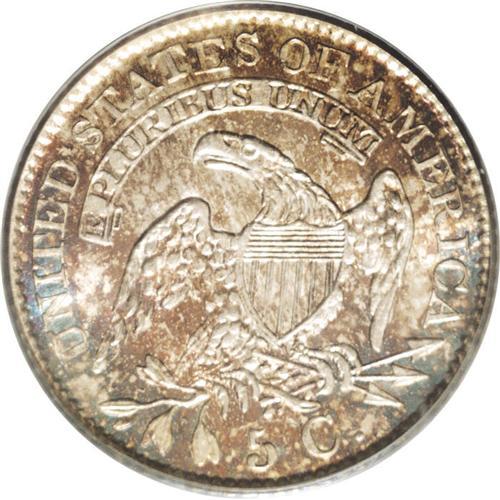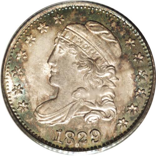 <B>1829<H10C> MS66 PCGS.</B></I> V-6, LM-5, R.1. The digit 1 in the date is doubled at the top, and there is an extra half-dentil between stars 9 and 10. On the reverse the E in STATES is sharply lower, and its right edge is in line with the left edge of the S in PLURIBUS. Lush mint-green peripheral toning envelops both sides, while the obverse center is silver-gold and the reverse is offers deeper amber and magenta hues. Despite the moderately deep patina, brilliant cartwheel luster emerges unimpeded from beneath.