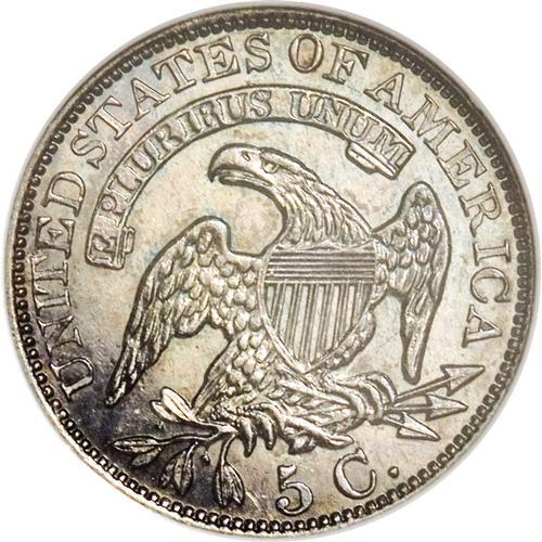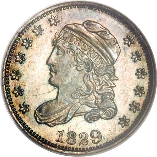 <B>1829 H10C PR64 NGC.</B></I> V-12, LM-13, R.7 as a proof. NGC has certified 10 proof 1829 half dimes, none with an indication of Valentine number. A perusal of past auction appearances lists proof V-2, V-3, and V-7 examples in NGC and PCGS holders. No other proof V-12 examples were found. The present piece is identifiable by a backward S lintmark in front of the cap, and a second lintmark is adjacent to the lowest leaf pair. It was described as possibly unique as a V-12 proof in two different auctions, Heritage 8/96 and Bowers and Merena 8/99. Fully struck and nicely mirrored with light to medium aqua-blue and rose toning. Census: 6 in 64, 2 finer (10/06).<BR><I>Ex: Denver ANA Signature (Heritage, 8/96), lot 6901; Long Beach Connoisseur Collection (Bowers and Merena, 8/99), lot 78; Benson Collection, Part Two (Ira and Larry Goldberg, 2/02), lot 347.</B></I><BR><I>From The Jones Beach Collection.</B></I><BR><BR><b>Shipping:</b> Coin/Currency (<a target="_blank" href="http://www.heritageauctions.com/common/shipping.php">view shipping information</a>)