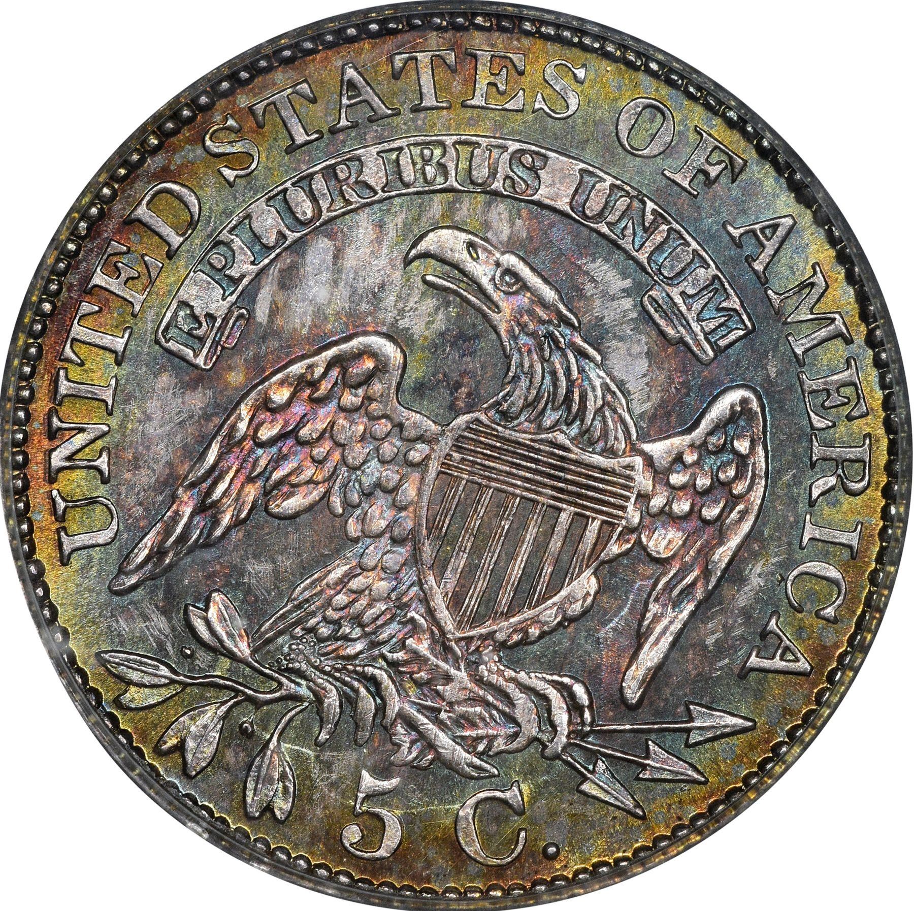 Description: This satiny and lustrous half dime is fairly afire with vibrant crimson and golden variations on the silver-gray obverse, while the reverse offers a colorful rainbow array of varied blue, roe, green, and gold iridescence. Sharply struck.