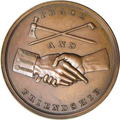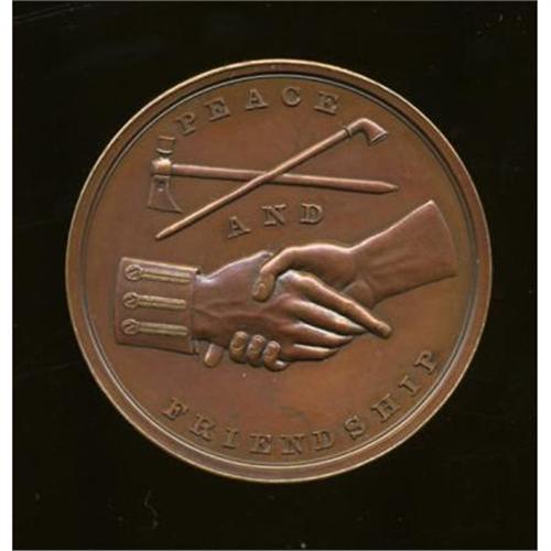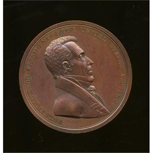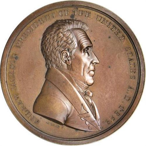 <B>1829 Andrew Jackson Indian Peace Medal, Second Size, Second Reverse, Julian-IP-15, MS63 NGC.</B></I> Bronzed copper, 125.7 gm, rim 5.3 mm, 62.3 mm. Dies by Moritz Furst and John Reich. Obverse bust right, rev. clasped hands, pipe and tomahawk, PEACE AND FRIENDSHIP, flat-topped A's, finger pointing between F and R. A richly colored mahogany-brown piece with some prooflikeness remaining, light carbon and generous eye appeal. Complete with NGC Photo Certificate specifying "Reverse Dies of 1846." Another delightful example of this popular and rare series of medals featuring "Old Hickory" himself, Andrew Jackson. A "Nice AU" example in the illustrious Kessler-Spangenberger sale, (NASCA, 4/1981, lot 1605), realized $170 against a presale estimate of $100. This certified Select specimen should do much better.<BR><BR><b>Shipping:</b> Coins & Currency (<a target="_blank" href="http://www.heritageauctions.com/common/shipping.php">view shipping information</a>)