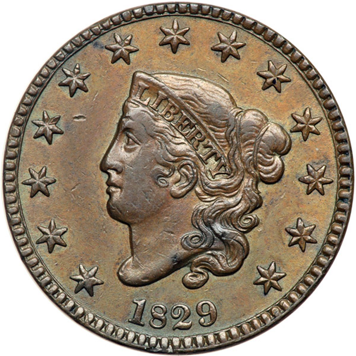 1829 N-1 R3 EF40. Glossy medium brown and light olive with satiny mint frost covering the protected areas on both sides. The only marks on an otherwise choice example are a small nick right of star 4 and two spots of darker olive brown toning on the lower half of the reverse. Nicely struck EDS.