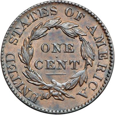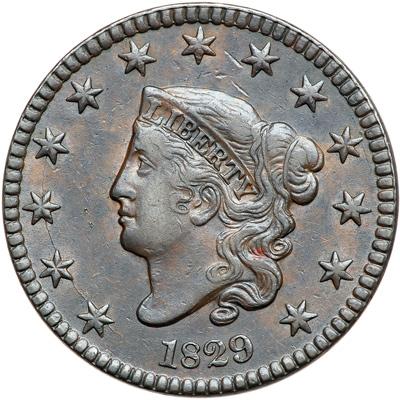 1829 N-2 R2. VF-35. Frosty olive and steel mixed with lighter brown, especially on the reverse. Satiny mint luster covers the protected areas. The only marks are a couple nicks at star 8. MDS with the usual die cracks at stars 1-4 and 11-13.