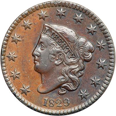 1829 N-2 R2. VF-35. Slightly sharper with too many tiny rim nicks for the sharpness grade. Glossy medium brown and light chocolate with darker reddish chocolate brown covering the right half of the obverse. LDS with die cracks through stars 1-4 and 11-13.