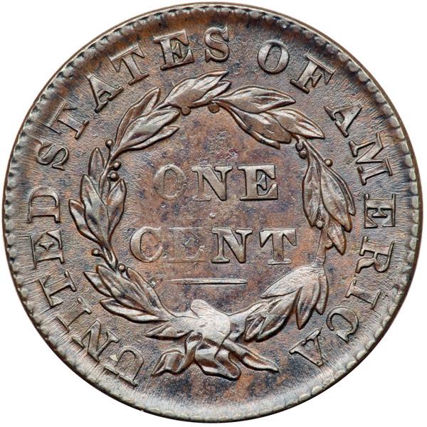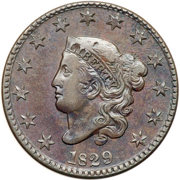 1829 N-5 R3 Small Letters Reverse VF30. Sharpness EF40 or better but there is a patch of roughness at the top of the hairbun, a small one in the hair over the B in LIBERTY, and a couple specks of reddish verdigris over the N in ONE. The remainder of the planchet is smooth and very attractive with satiny mint luster covering the fields and protected areas. The surfaces, except for the small areas mentioned, are consistent with a significantly higher grade. Mottled mix of reddish chocolate, dark chocolate brown, and lighter steel brown. MDS. The strike is weak on the stars, over LIB, and along the bottom of the wreath, as usual for this Small Letters variety.