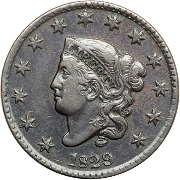 1829 N-5 R3+ VF30. Small Letters Reverse. VF-30. Five points sharper with extremely faint roughness in a few protected areas of the obverse, mostly in the field behind the head. No contact marks. The fields and protected areas are covered with fine flowline luster, and the eye appeal is quite nice in spite of the minor roughness. Frosty dark chocolate and steel brown. Late die state with dentil crumbling at stars 3-5 and below star 11. Very well struck for the variety. DWH #3294.
