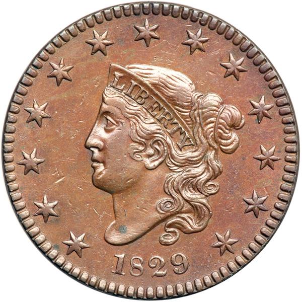 1829 N-6 R1 VF35. VF-35. Slightly sharper but lightly cleaned, now retoned glossy light to medium reddish brown. A few trivial ticks and a small spot of dark olive toning on the bust are the only marks. Sharply struck EDS. The dentils are sharp around both sides and the inner circle fragments are crisp. DWH #0699.