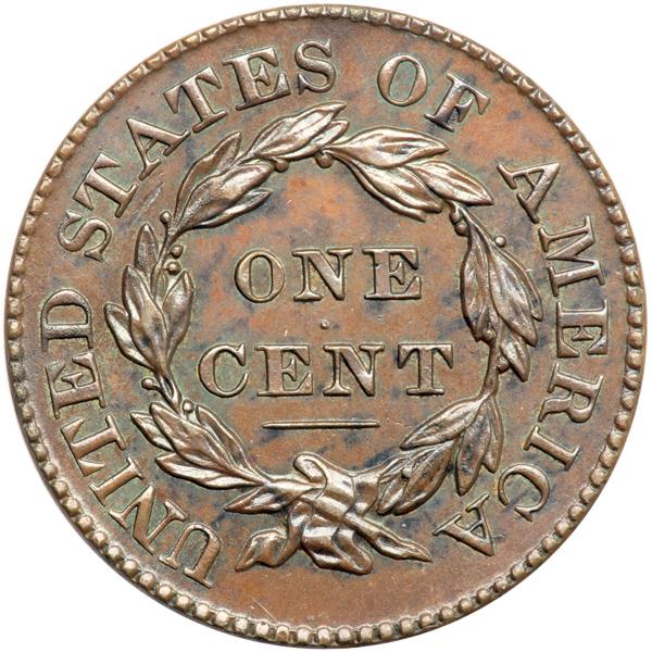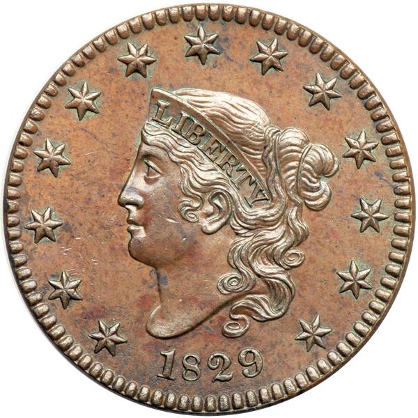 1829 N-6 R1. PCGS graded MS-63 Brown. A sharply struck cent but there are traces of microscopic porosity in the field below the date and around star 1, plus a dull nick under the first T in STATES. Glossy medium brown and chocolate delicately mottled with some reddish chocolate tones around the date and darker olive brown tones on the reverse. M-LDS. The dentils are sharply defined but only a couple of the inner circle segments remain visible on the obverse. The fields are smooth and slightly reflective on both sides, and the eye appeal is excellent. Our grade is AU55. Pop 1; 1 finer in 66. Only 3 graded at PCGS for the variety. DWH #2607 (PCGS # 36919) .