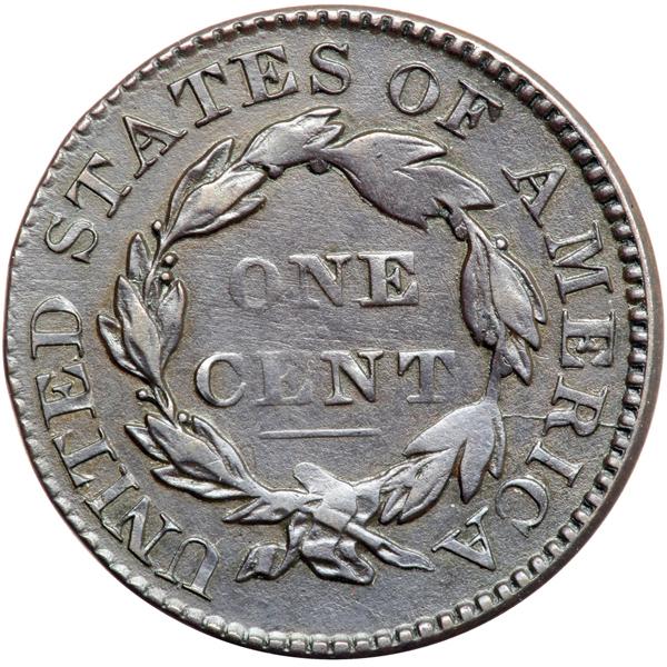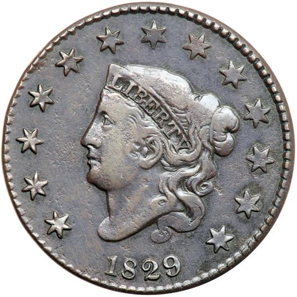1829 N-7 R3 F12. Wheelspoke Reverse. Fine-12. Sharpness VF20 but covered with faint roughness under a frosty dark olive and steel patina. No verdigris, and the only mark is a barely visible rim bruise left of star 5. Early die state with a single "Wheelspoke" die crack on the reverse (from the dentils through the R in AMERICA into the wreath below, as seen on the earlier N-4 marriage). Noyes graded VF20 net F12, his photo #21108. DWH #3540.