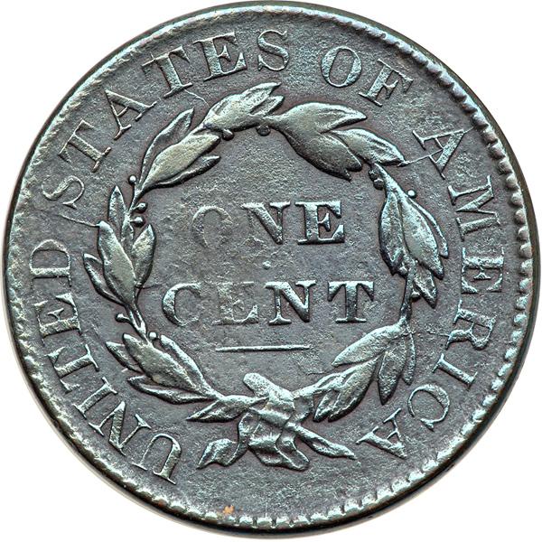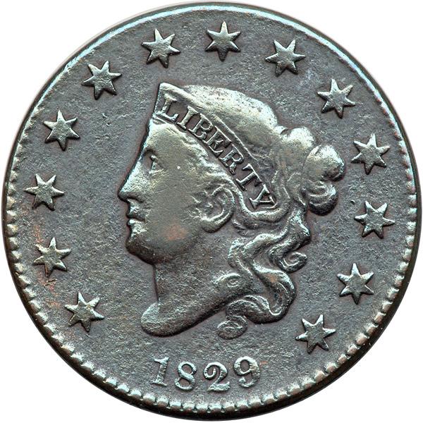 1829 N-7 R3. Fine-12. Sharpness VF20 or a bit better but the surfaces are slightly rough. No verdigris or contact marks. This cent was burnished to minimize the roughness and is now toned glossy dark bluish steel. Nicely struck LDS with all 5 of the reverse "Wheelspoke" die cracks clear.