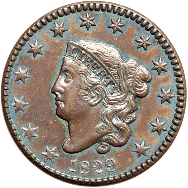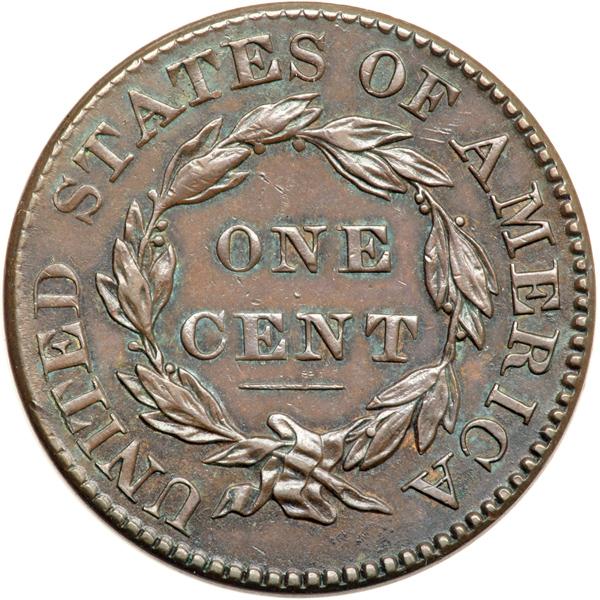 1829 N-8 R1 EF45. Rotated Reverse. EF-45. Glossy chocolate brown with bluish steel toning in the protected areas. Very attractive, just a few trivial contact marks, including a tiny vertical hairline scratch between the E and N in CENT. Sharp EDS with smooth, slightly reflective fields on both sides and no crumbling in the dentils. The reverse is rotated 45 degrees CW. DWH #0705.