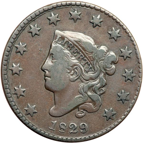 1829 N-9 R4 F15. Small Letters Reverse. Fine-15. Choice glossy chocolate brown with darker steel brown toning on the highpoints and some lighter brown toning in protected areas of the reverse. The surfaces are smooth and show only a few minor contact marks, including a small pinprick in the field before the forehead and a tiny pinscratch between stars 3 & 4. Nicely struck EDS. The obverse die is uncracked and the 3 A’s in the reverse legend show no crumbling inside their tops. Removed from an NGC slab graded EF40 (NGC label included, and it shows the attribution and Reiver provenance). DWH #2925.