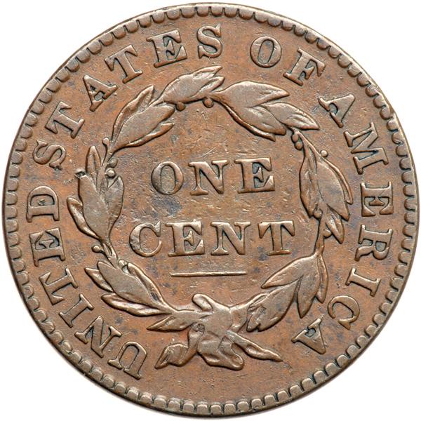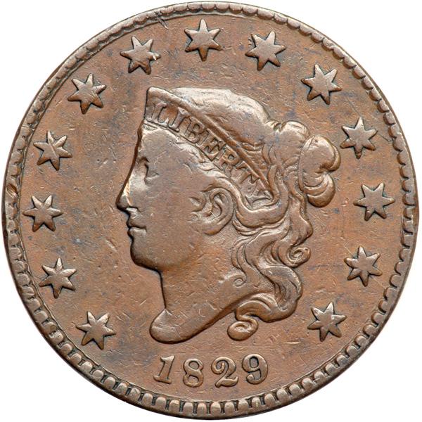 1829 N-9 R4 F15. Small Letters Reverse. Fine-15. Attractive glossy medium brown. A light nick on the tip of the nose and a pinprick touching the leaf under the first S in STATES are the notable marks. Nicely struck MDS with none of the strike weakness often found on these small letters varieties. There is an arc crack through star 4 and the head to star 12 and the rim at right, strongest at star 12. Both A's in AMERICA are filled while the A in STATES is still open. DWH #0709.