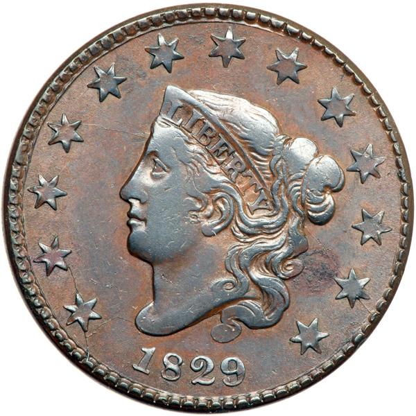 1829 N-9 R4 VF30. Small Letters Reverse. VF-30. Ten points sharper with a small patch of microscopic roughness in the field between star 12 and the main curl, plus similar patches of roughness on the right side of the reverse. Otherwise the surfaces are satiny and free of defects. Glossy reddish steel brown and chocolate with lustrous lighter steel brown in protected areas. The satiny surfaces and luster suggest a higher sharpness grade, but striking weakness in the usual areas of the hair and leaves makes it difficult to reach any higher. LDS with additional fine die cracks through stars 1-5 extending to the dentils below star 1 plus weaker extensions to the bust tip and neck. All 3 of the A's in the reverse legend are now filled. At the lower end of the condition census for this tough variety. DWH #0711.