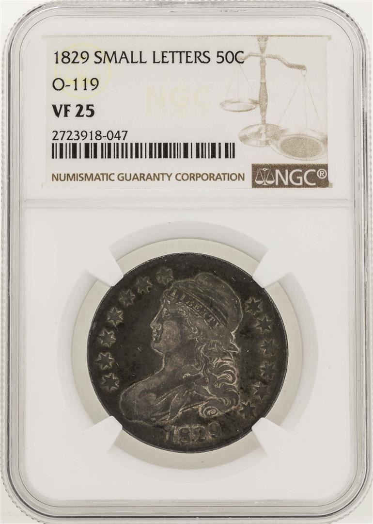 One 1829 Small Letters Capped Bust Half Dollar Coin O-119 NGC VF25. NGC Certified.