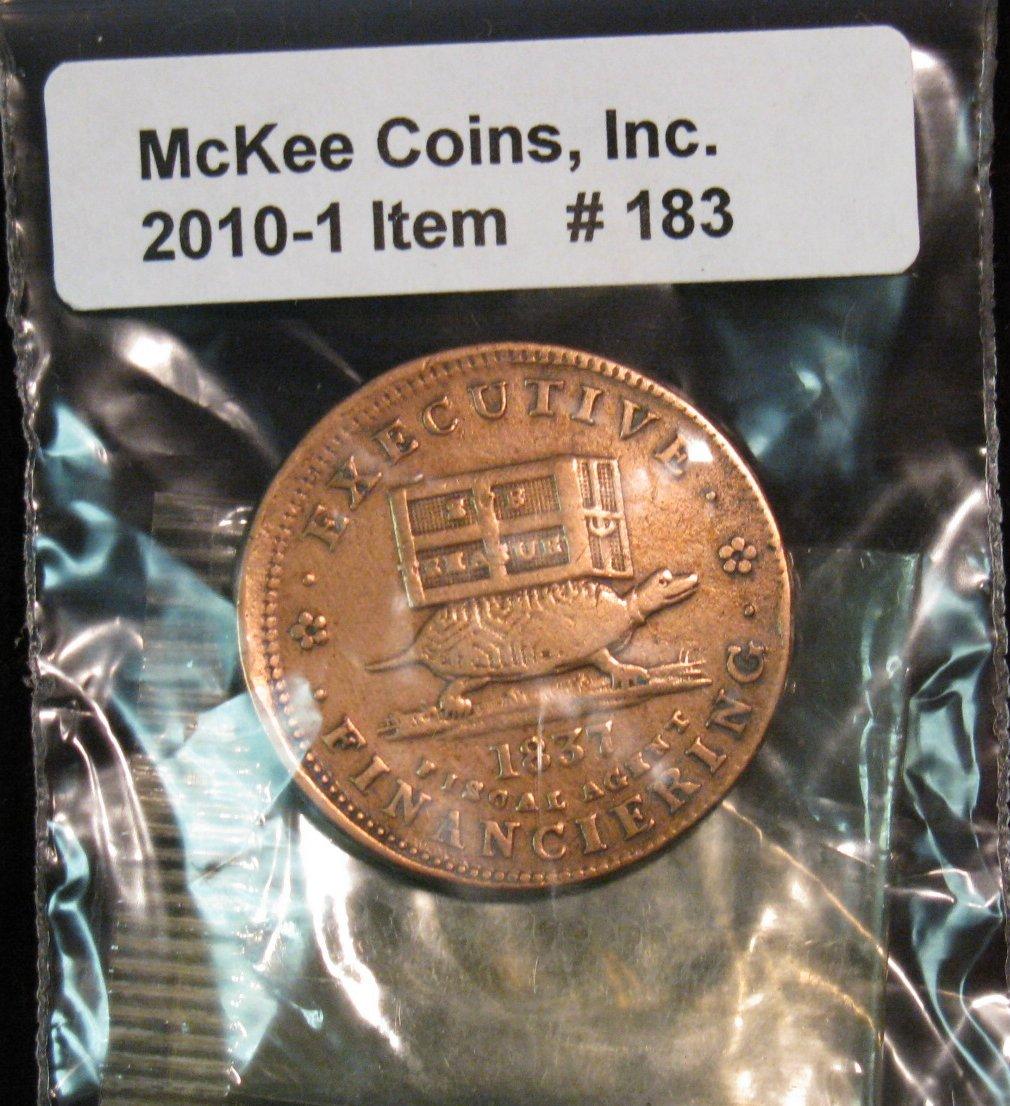 183. 1837 U.S. Hard Times Token. "Executive Financiering" Cleaned VF. Depicting donkey & Turtle with box.