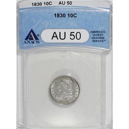 <B>1830 10C Medium 10C AU50 ANACS.</B></I> NGC Census: (2/135). PCGS Population (9/134). Mintage: 510,000. Numismedia Wsl. Price for NGC/PCGS coin in AU50: $292. (#4516)<BR><BR><B>Coin Engraver:</B> John Reich<BR><BR><b>Shipping:</b> Coins & Currency (<a target="_blank" href="http://www.heritageauctions.com/common/shipping.php">view shipping information</a>)